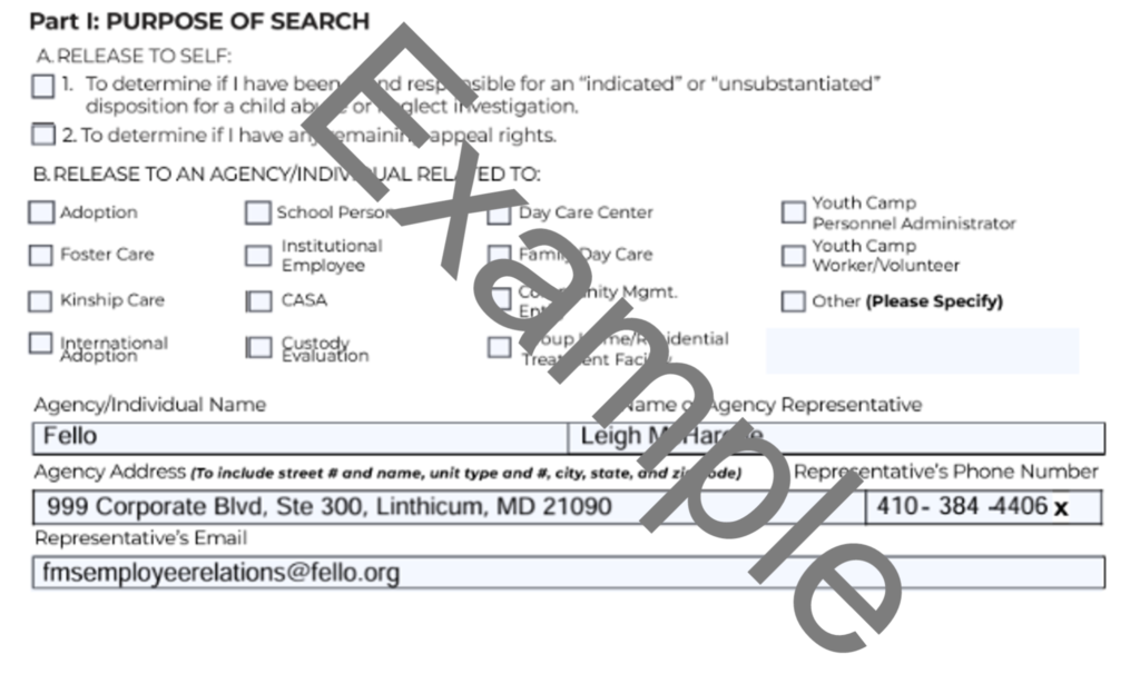 Pursuant to Code of Maryland Regulations § 07.02.07, pertaining to the confidentiality of Child Protective Services investigations and reports, the applicant authorizes the Maryland Department of Human Resources (DHR) to notify Fello (agency or individual listed in Part I) whether a local department of social services has identified the applicant as responsible for “indicated” child abuse or neglect in any record maintained by the Maryland Department of Human Resources, any local department of social services, and Child Protective Services.